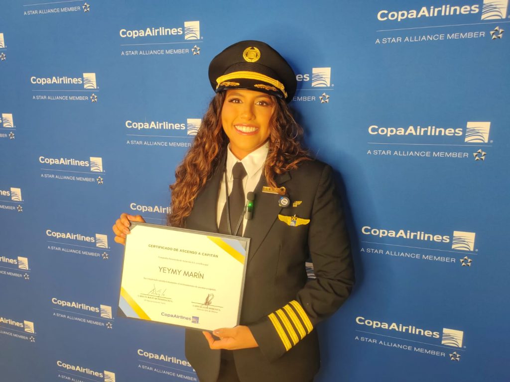 La capitana Yeymy Marín se enamoró de la aviación en su último año de escuela, al asistir a un verano aéreo en el Aeropuerto Scarlett Martínez. “Ese fue mi primer encuentro con la aviación, antes no había tenido la oportunidad de viajar. Luego le dije a mi papá ¡necesito vivir de nuevo la experiencia! y él me llevó al Aeropuerto de Panamá Pacífico, por primera vez allí vi a unos pilotos uniformados y eso terminó de convencerme de que esa era la profesión que yo quería estudiar”.