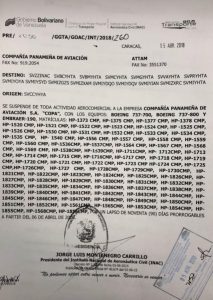 la labor del Poder Judicial y el Poder Ciudadano, en lo relacionado con la prevención de la delincuencia organizada y el financiamiento al terrorismo, suspenden a partir del 06 de abril de 2018, por un lapso de 90 días prorrogables, todos los vuelos de la Compañía Panameña de Aviación S.A (Copa Airlines) desde y hacia el territorio nacional, como medida para proteger el Sistema Financiero Venezolano”.