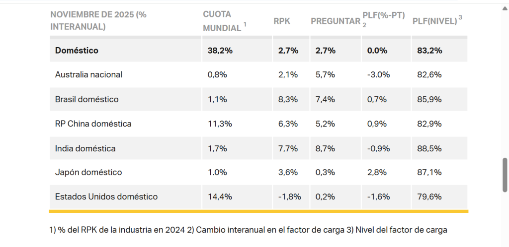 El RPK nacional aumentó un 2,7% con respecto a noviembre de 2024 y el factor de ocupación se mantuvo estable en el 83,2% gracias a una expansión de la capacidad del 2,7%. Brasil e India fueron los mercados de mayor crecimiento. El tráfico nacional estadounidense fue el único mercado importante que registró una caída en la demanda, posiblemente debido al cierre del gobierno.