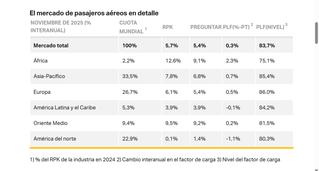 La demanda aérea de pasajeros a nivel global mantuvo su ritmo de crecimiento en noviembre del año pasado respecto al mismo período de 2024, mientras que el factor de ocupación logró un récord de 83,7%, un máximo histórico , resalta la Asociación de Transporte Aéreo Internacional (IATA, por sus siglas en inglés), en su reporte de ese mes.