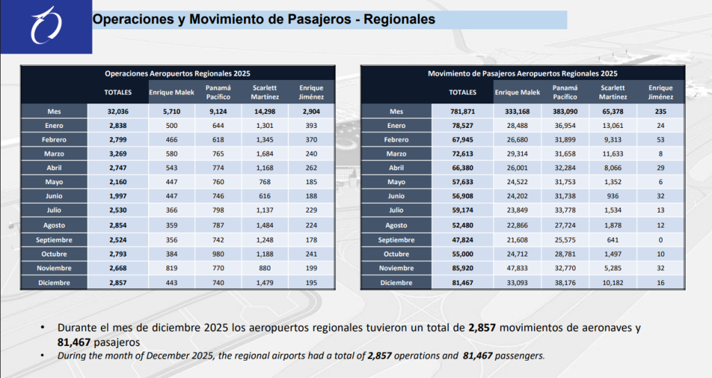 En enero de 2026, los aeropuertos regionales de Panamá movilizaron 85,596 pasajeros, de los cuales 35,706 correspondieron al Aeropuerto Internacional Panamá Pacífico, que se ubicó como el segundo con mayor tráfico del mes, muy cerca de Enrique Malek.