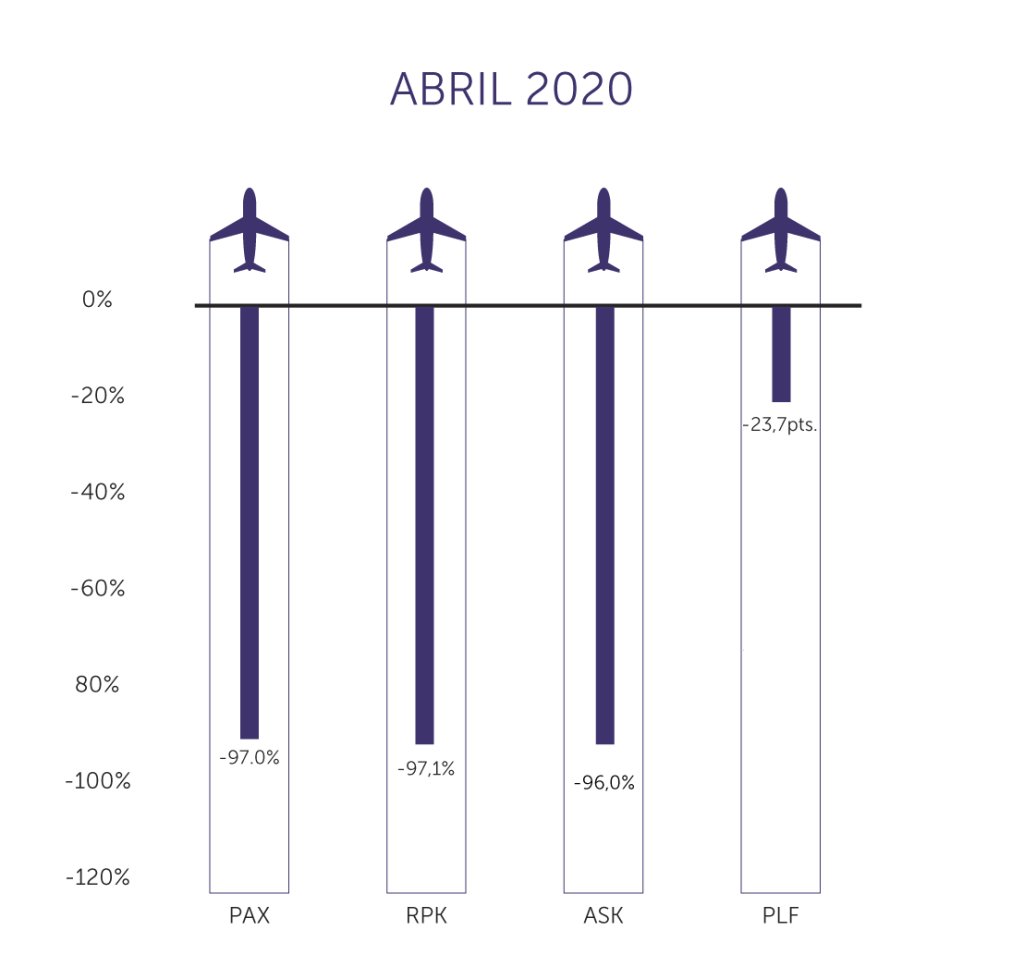 El tráfico (RPK) cayó 97.5% y la capacidad (ASK) disminuyó 96%, llevando el factor de ocupación a 61.5%.