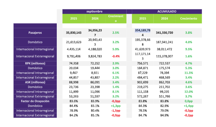 • En el acumulado enero-septiembre, LAC registra 354,2 millones de pasajeros, un 3,8% más que en 2024.