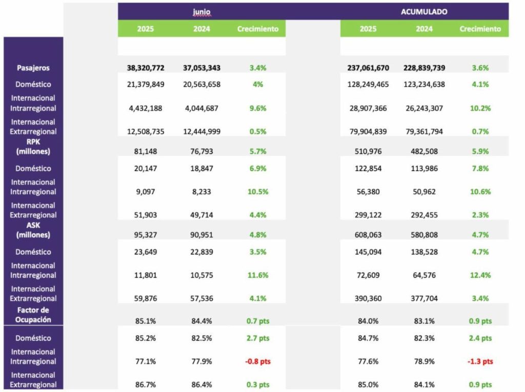Entre enero y junio, la región movilizó 237 millones de pasajeros, un 3.6% más que en el mismo periodo de 2024, con un factor de ocupación promedio del 85.1%. Más del 90% del crecimiento neto provino de rutas dentro de la región, consolidando a la aviación como un motor clave de integración regional.