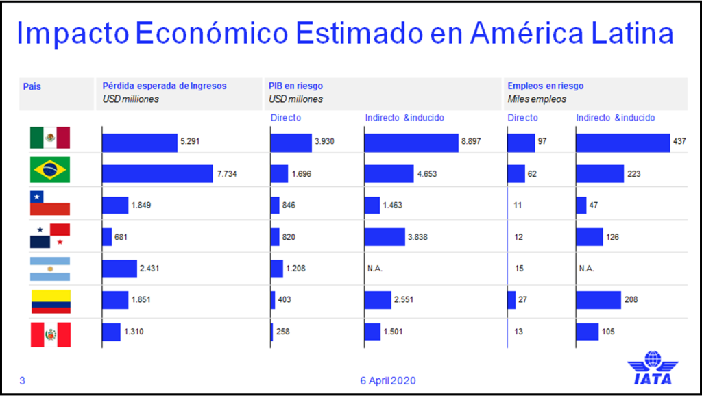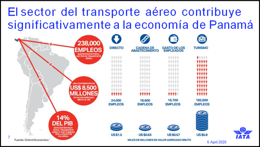 Según previsiones de IATA, como consecuencia de la crisis del COVID-19, la contribución del sector al PIB de Panamá podría bajar unos 4,600 millones de dólares (US) y colocar hasta 12,000 puestos de empleo directos y 126,000 indirectos en riesgo.