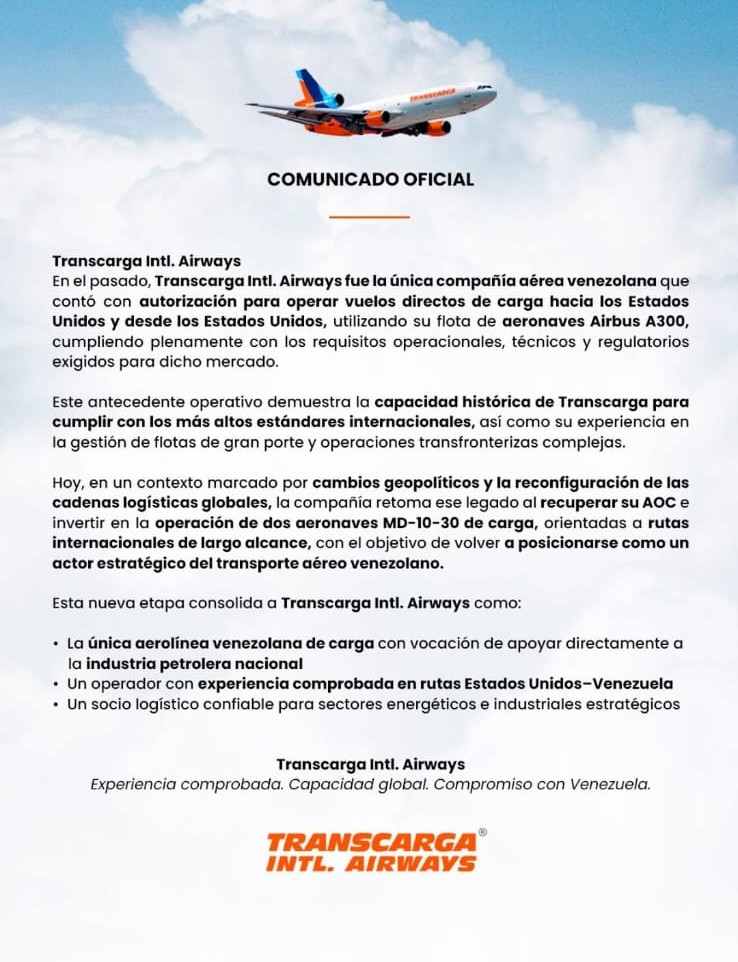 La aerolínea venezolana Transcarga Intl. Airways anunció el inicio de una nueva etapa operativa con la recuperación de su Certificado de Operador Aéreo (AOC) y una inversión orientada a retomar vuelos internacionales de carga, con especial atención en el mercado entre Venezuela y Estados Unidos.